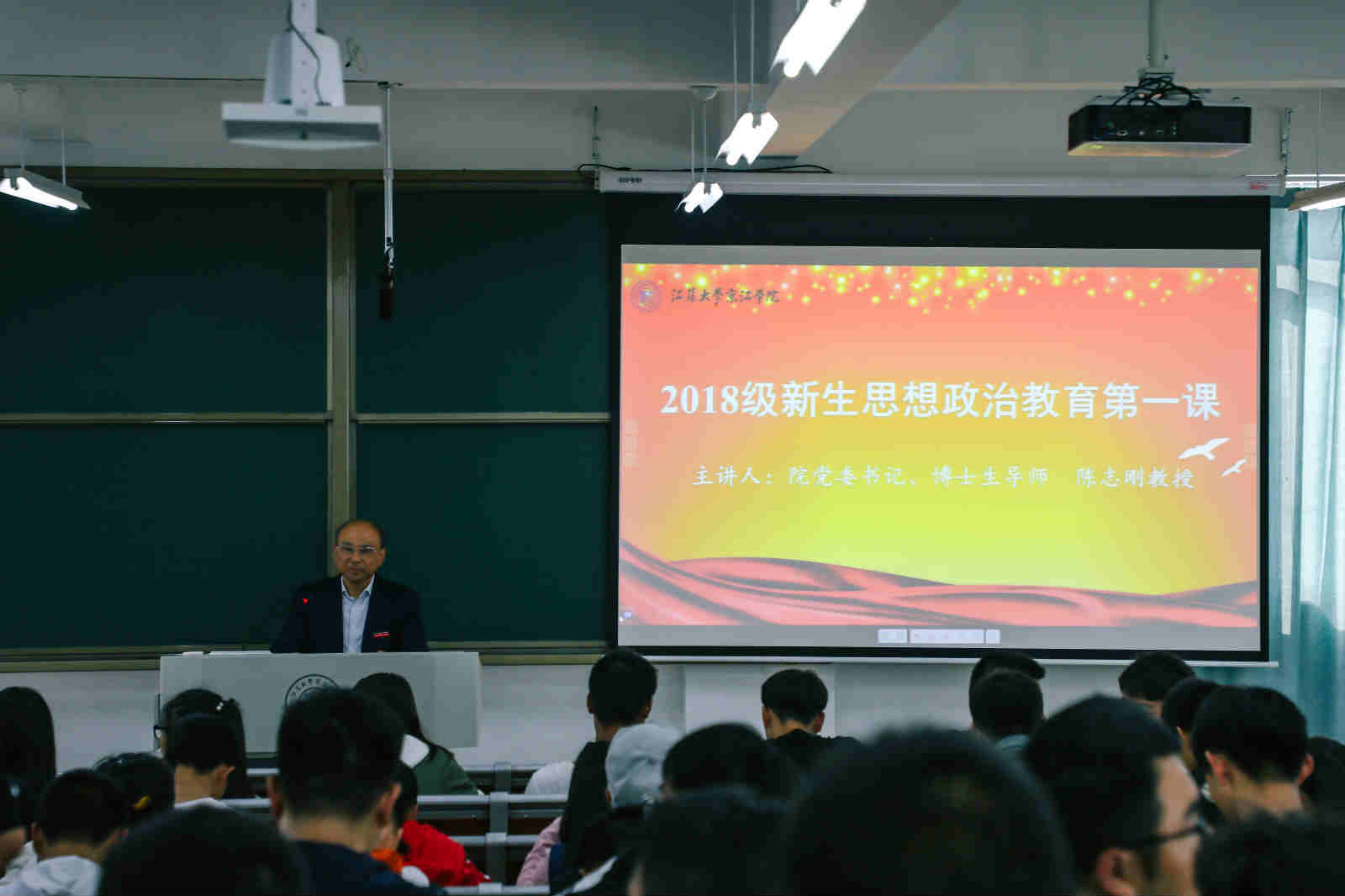 10月24日下午,在京江新校区的29个同步直播传送多媒体教室,我院党委书记陈志刚以《放飞青春梦想,书写人生华章》为题,为2018级新生讲授了思想政治教育第一课。2018级全体辅导员参加了活动,活动由2018级学工办主任罗晓庆主持。