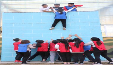 素质拓展活动在“挑战五分钟”游戏中拉开序幕,为使拓展训练项目更具挑战性,参训教师分为两个战队进行比拼,制作队旗、设计队徽并做展示。活动设置了“挑战信任背摔”、“急速60秒”、“雷区取水”、“七巧板”、“翻越模拟围墙”等项目,团队的凝聚力、合作意识、沟通交流意识不断得到锻炼和加强。活动结束后,参训教师们从不同角度总结了各自的付出与收获,真切感受到了团队的力量。