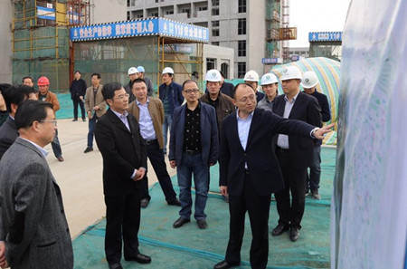 张叶飞市长等市领导来到京江校区建设现场,听取了张济建副校长关于京江校区功能布局、工程进度、工程质量和建筑风格等情况的汇报。京江校区总面积26.9万㎡,主体封顶的建筑面积已达到14.3万㎡,目前正进入内外装施工及安装施工,12.6万㎡已进入桩基施工阶段。