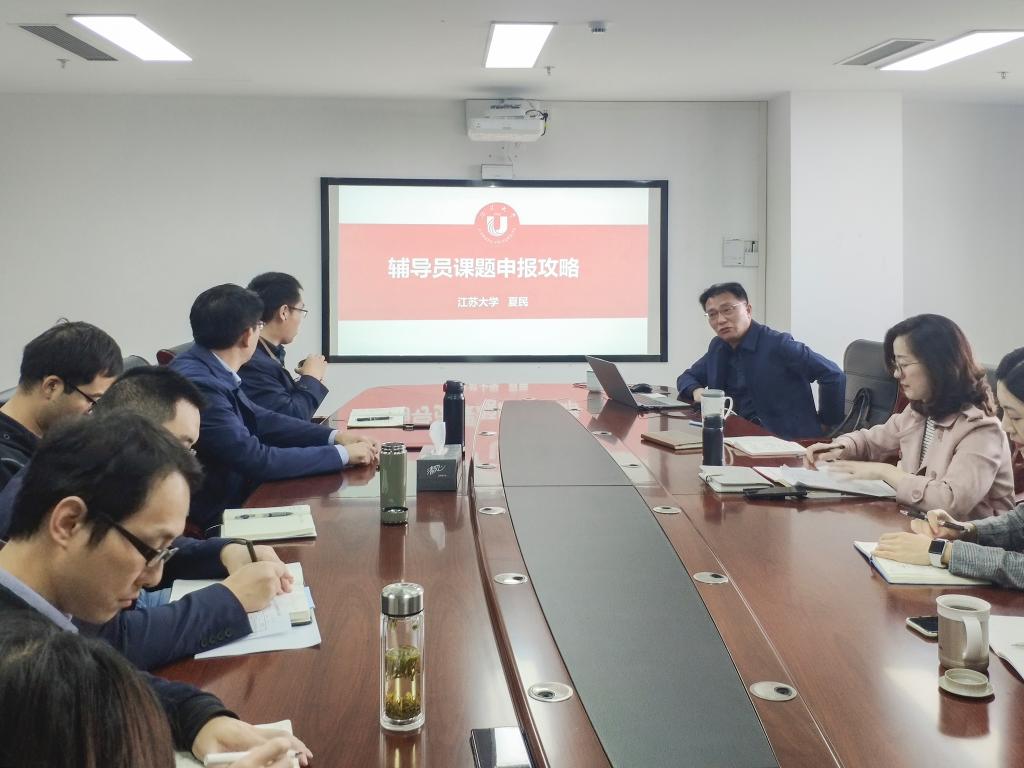为加强学院师资队伍建设,提高辅导员科研学术水平,11月2日,学生工作部和人力资源部特邀江苏大学纪委副书记夏民教授到我院,开展辅导员课题申报专题培训。全体学工人员、部分教师、有意向申报科研项目的行政管理人员参加了讲座。讲座由学院党委副书记、副院长吴立平主持。