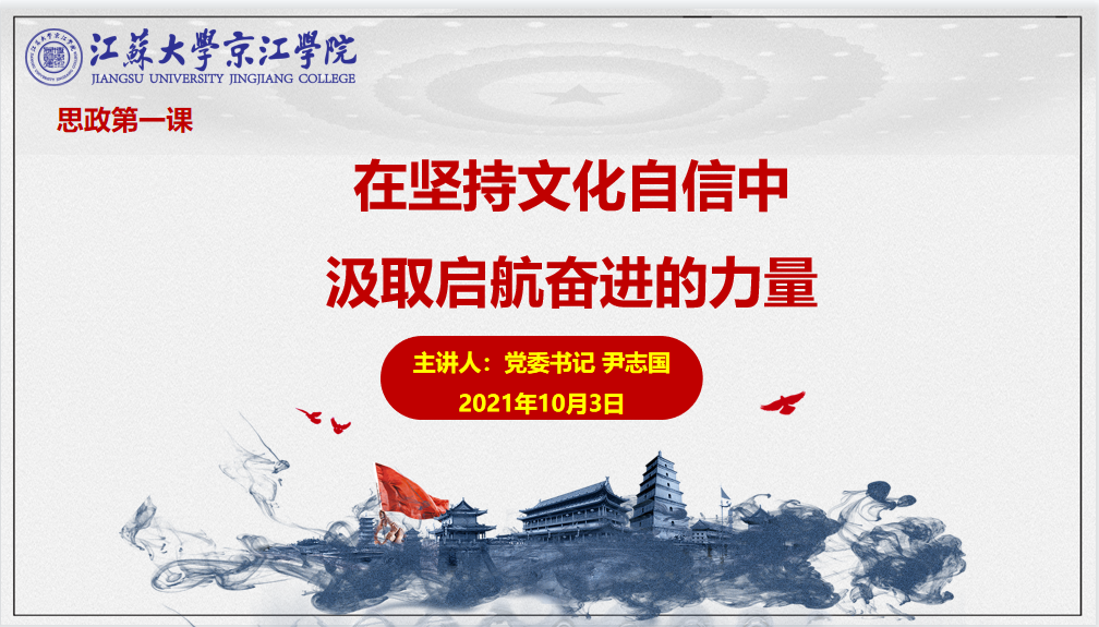 10月3日下午,院党委书记尹志国通过线上视频直播的方式,以《在坚持文化自信中汲取启航奋进的力量》为题,给2021年入学新生上了一堂生动的思政课。