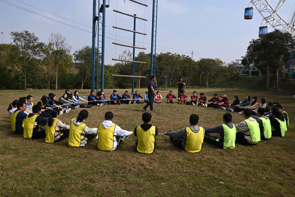 全体参训人员在教练的指导下分成4支队伍进行比拼。破冰活动消除了大家的陌生感,让现场的氛围温暖且轻松。在欢快的热身运动之后,4支队伍设计出各自的队伍名称、口号、标志和队形。在珠行万里、群龙取水、摸石头过河、动力绳圈等团体项目中,参训人员团结协作,克服畏难情绪,不断挑战自我。各队队员之间交流沟通、鼓励帮助、总结经验,努力以最短时间完成每项任务。活动现场气氛欢快,队员们的脸上都洋溢着笑容。