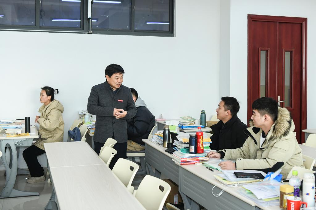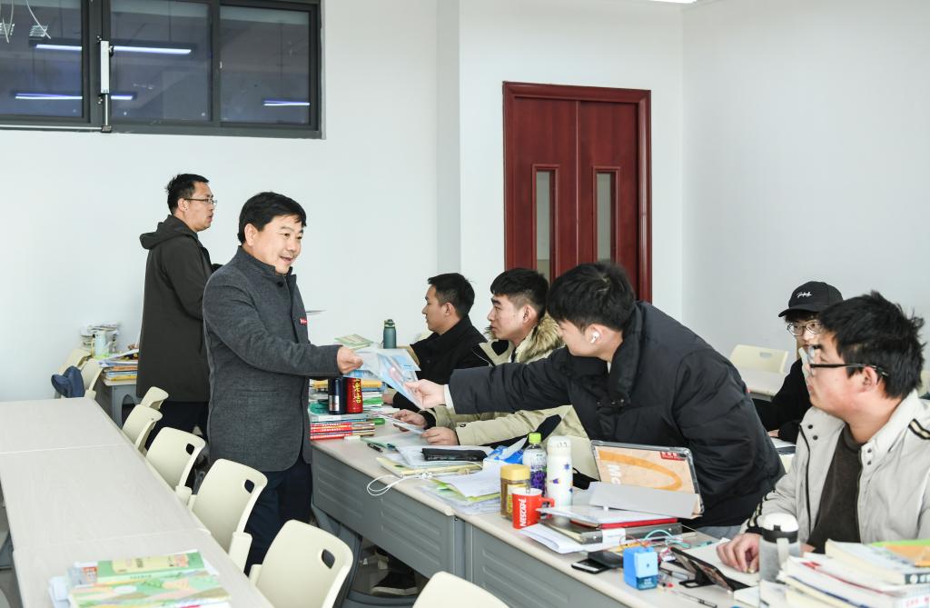 12月20日,院长赵喜仓,党委副书记、副院长吴立平以及相关职能负责人来到考研教室,看望并慰问了正在复习迎考的同学,给大家送去关心和鼓励,并发放了餐券和口罩。赵喜仓走进同学们中间,详细询问了大家的备考情况,并特别嘱咐同学们,在考研的最后冲刺阶段一定要注意保重身体,调整好心态,以良好的身体素质和心理素质迎接挑战。他还勉励同学们要相信天道酬勤,通过艰苦的努力一定会在考场上考出优异的成绩。