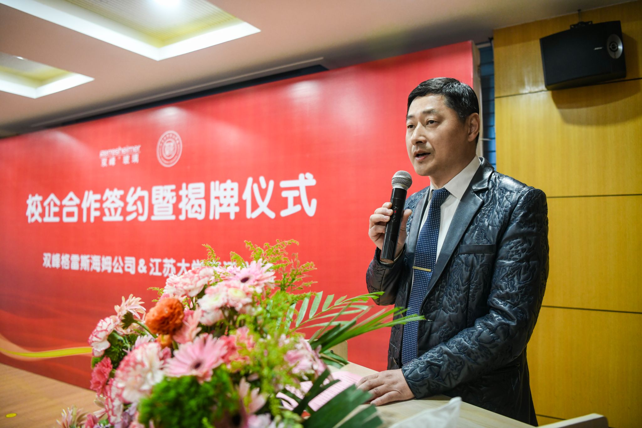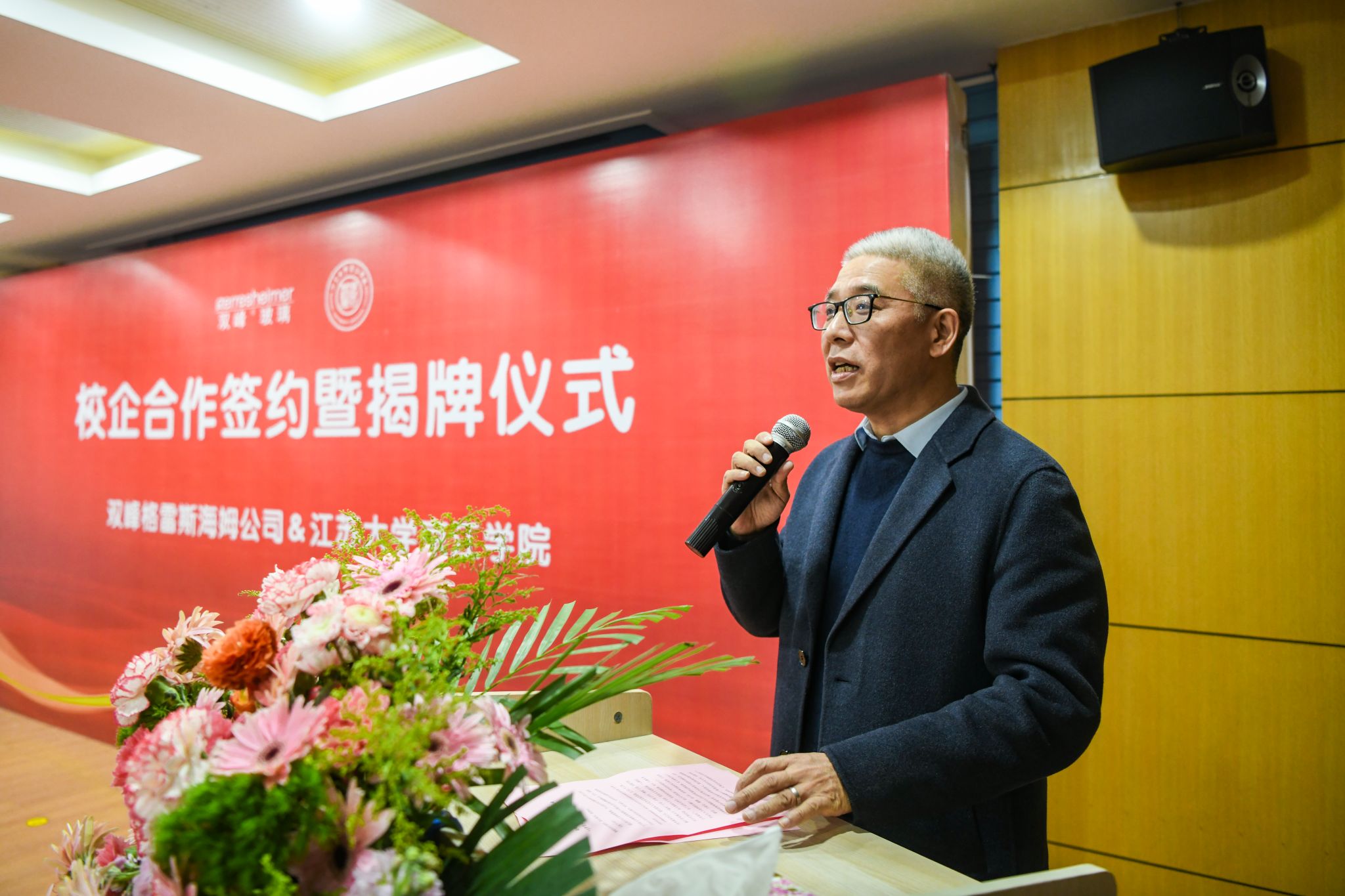 双峰格雷斯海姆医药玻璃有限公司高级总监姚文震致词,他表示,此次签约推进了校企之间的实质性合作,为企业高质量发展提供人才保证;同时,企业也将为大学生提供更多更好的实习实践岗位和成长提升机会,为行业和社会培养更多的优秀人才。
