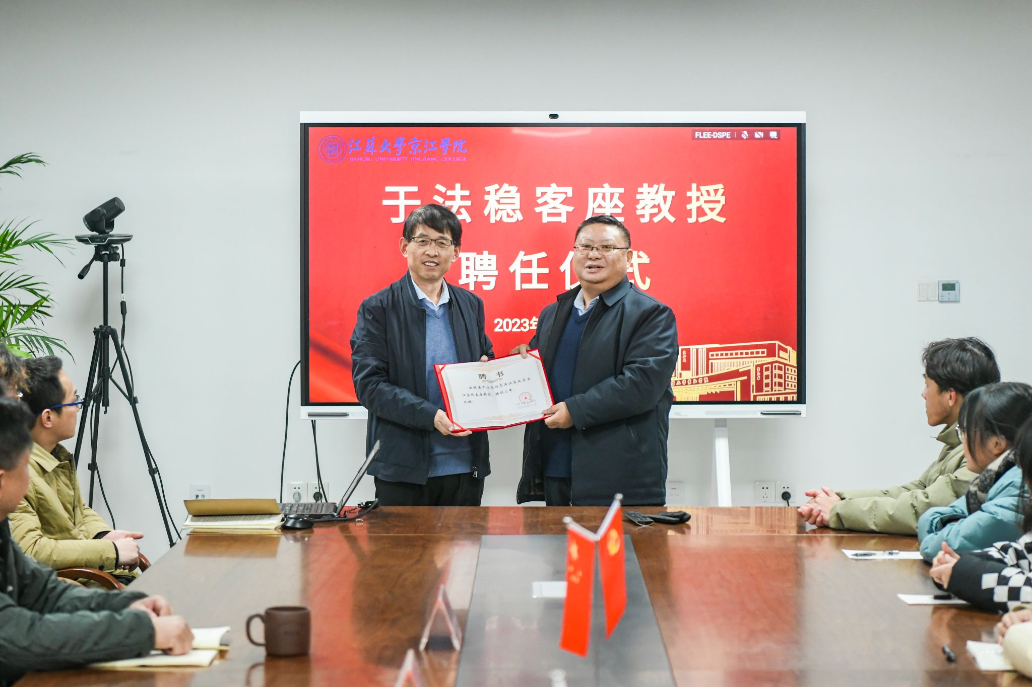杜道林对于法稳研究员受聘我院客座教授表示衷心感谢,并向现场师生介绍了于法稳的研究方向、学术成果及个人成就等。杜院长为于法稳颁发了客座教授聘书,并为其佩戴了院徽。