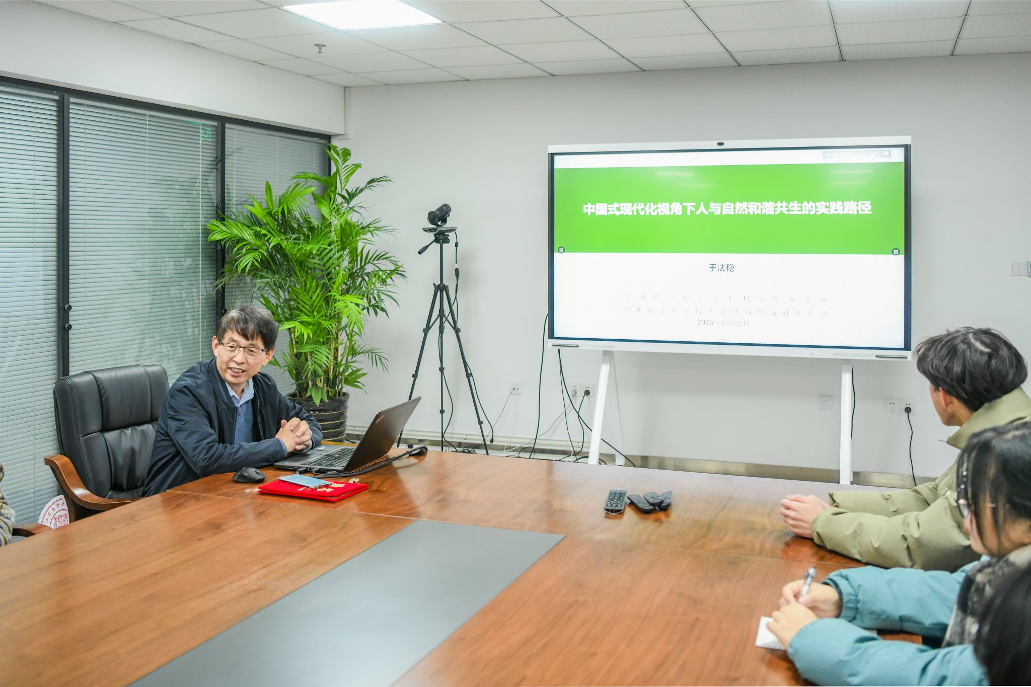 于法稳研究员为在场师生做了题为“中国式现代化视角下人与自然和谐共生的实践路径”的学术讲座。报告从新时代推动人与自然和谐共生的成效,实现人与自然和谐共生中的关键问题,实现人与自然和谐共生的实践路径三个维度展开。报告后,师生们就关心的生态补偿、土壤修复等问题与于法稳进行了互动交流。(撰稿单位:综合办公室)
