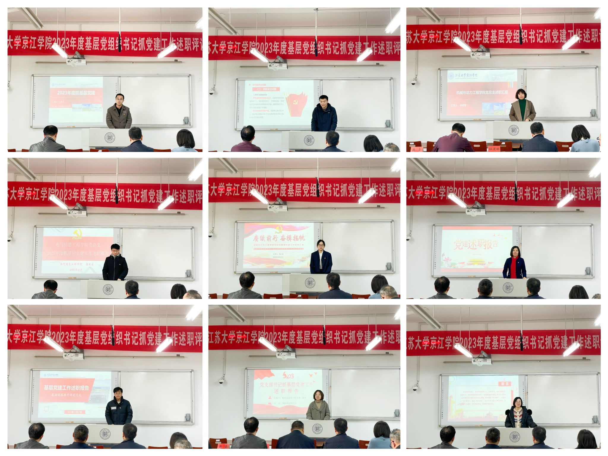 本次述职评议采取现场述职与书面述职相结合的形式进行,会上,机关直属党支部、二级学院(部)党总支共9个基层党组织书记围绕抓基层党建工作情况、存在的突出问题及下一步工作打算进行了现场述职。其他12个二级学院(部)党支部书记采用书面的形式进行述职。