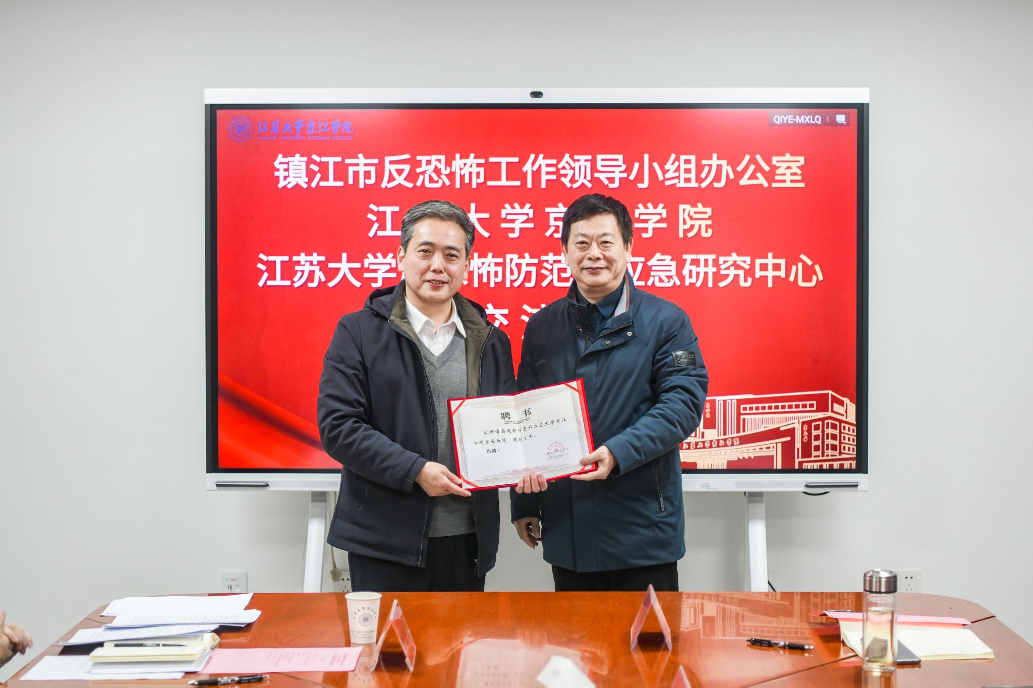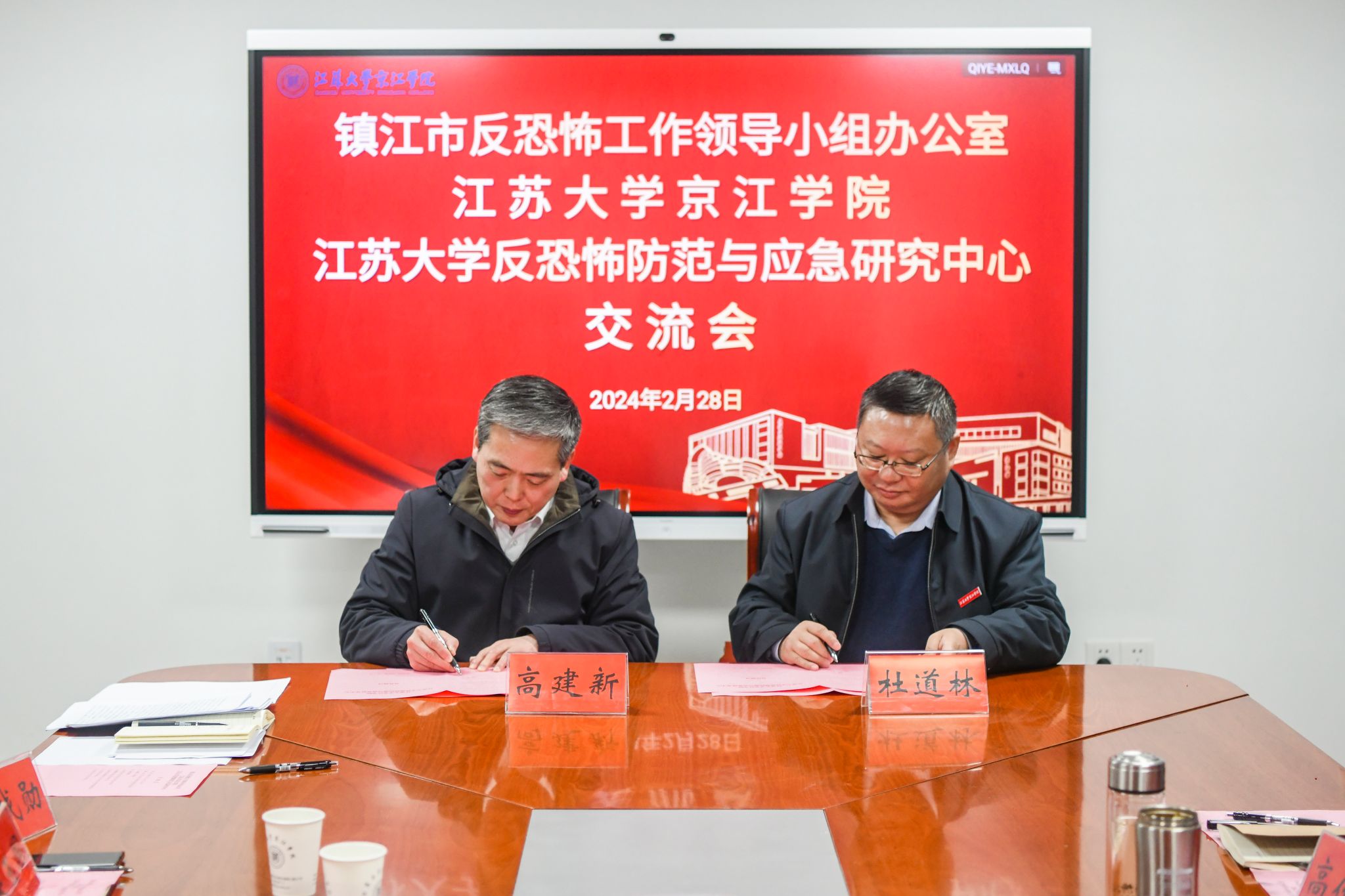 杜道林代表学院对高建新一行表示热烈欢迎并介绍了学院的基本情况。高建新介绍了镇江市反恐怖工作概况及取得成绩。崔金贵向高建新颁发了环球360会员登录客座教授证书,并为其佩戴了院徽。双方签订了合作协议。双方表示要加强合作交流,提高全民反恐防暴意识。