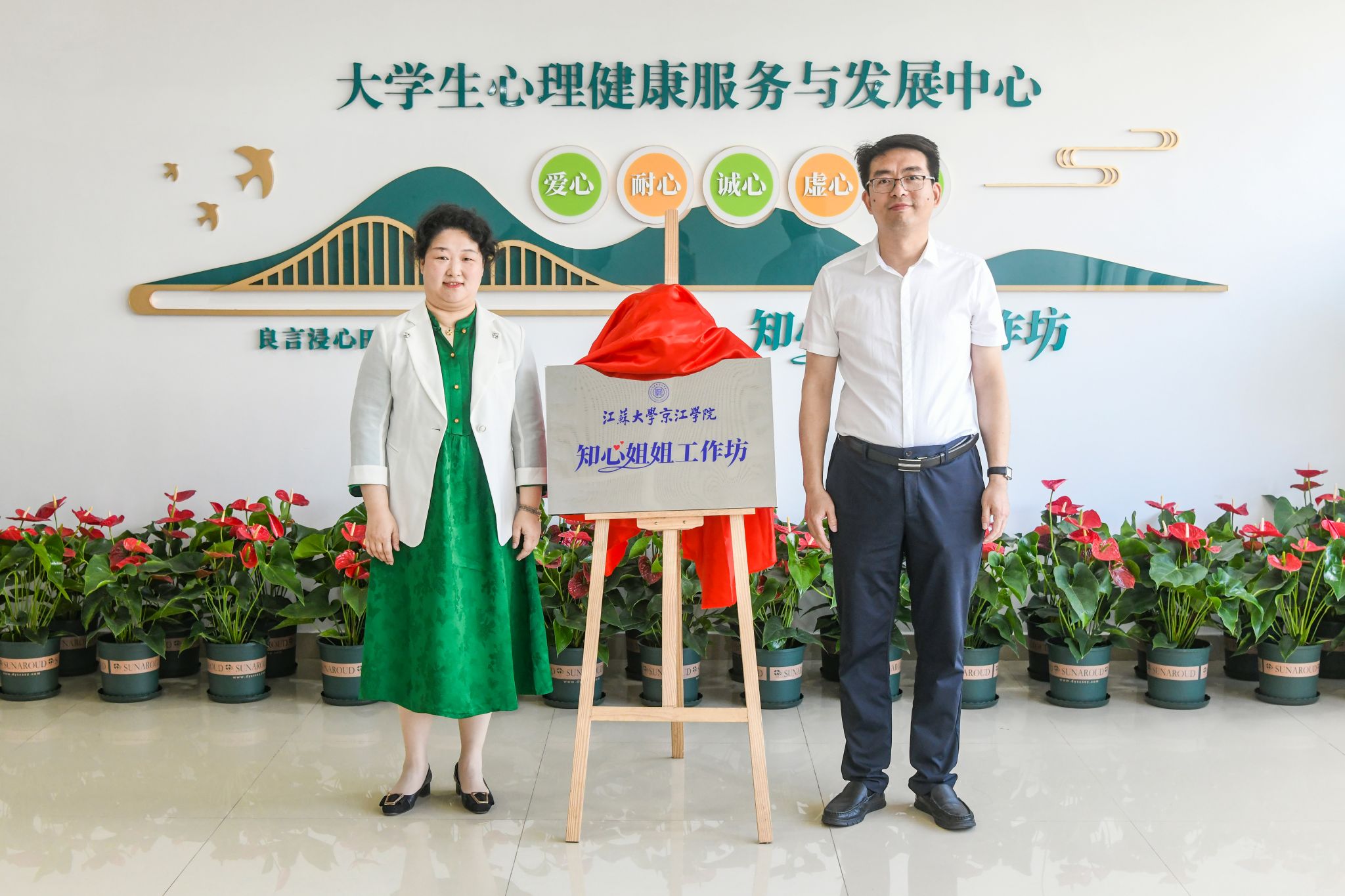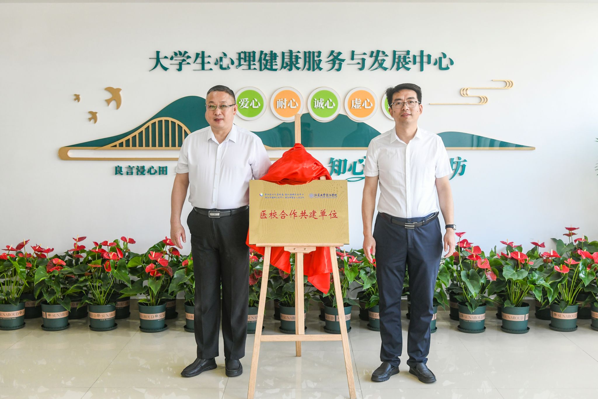 为进一步推进环球360会员登录心理健康教育工作规范化和专业化发展, 5月29日,环球360会员登录“知心姐姐工作坊”(大学生心理健康服务与发展中心)暨“医校共建”揭牌仪式在大学生活动中心顺利举行。镇江市精神卫生中心党总支书记曹卫东一行,江苏大学心理健康教育与指导中心副主任陆菁,环球360会员登录党委副书记、纪委书记蒋豪,党群工作部负责人丁红梅,全体专兼职心理教师等参与了揭牌仪式。仪式由学生工作部部长赵吉庆主持。