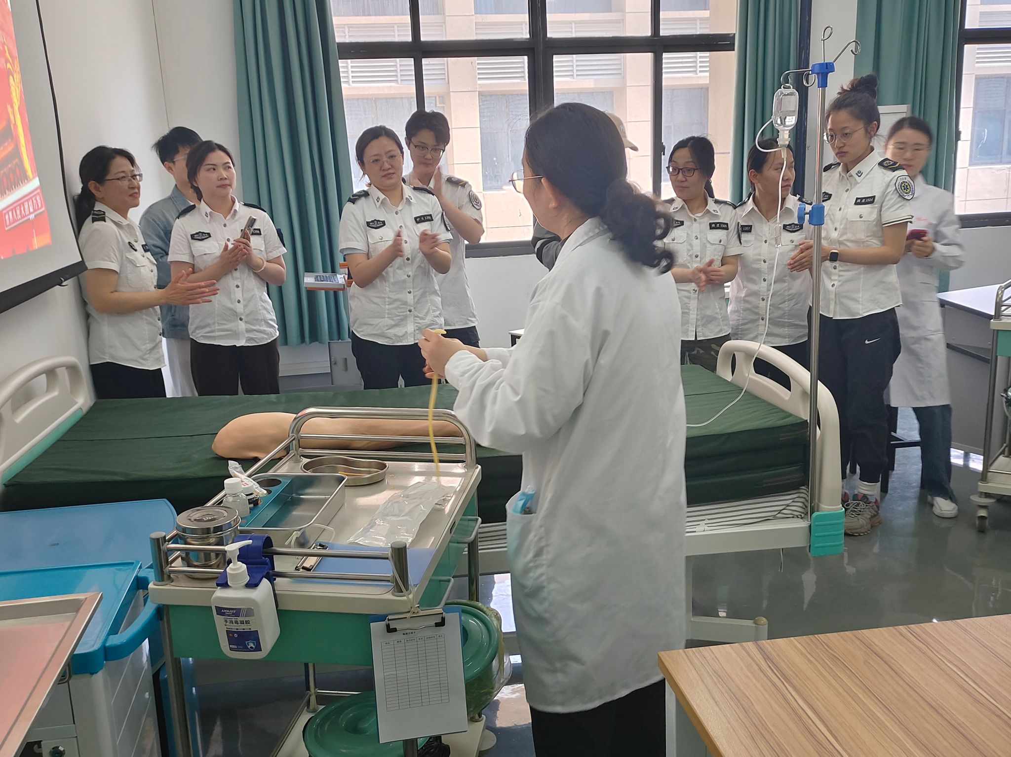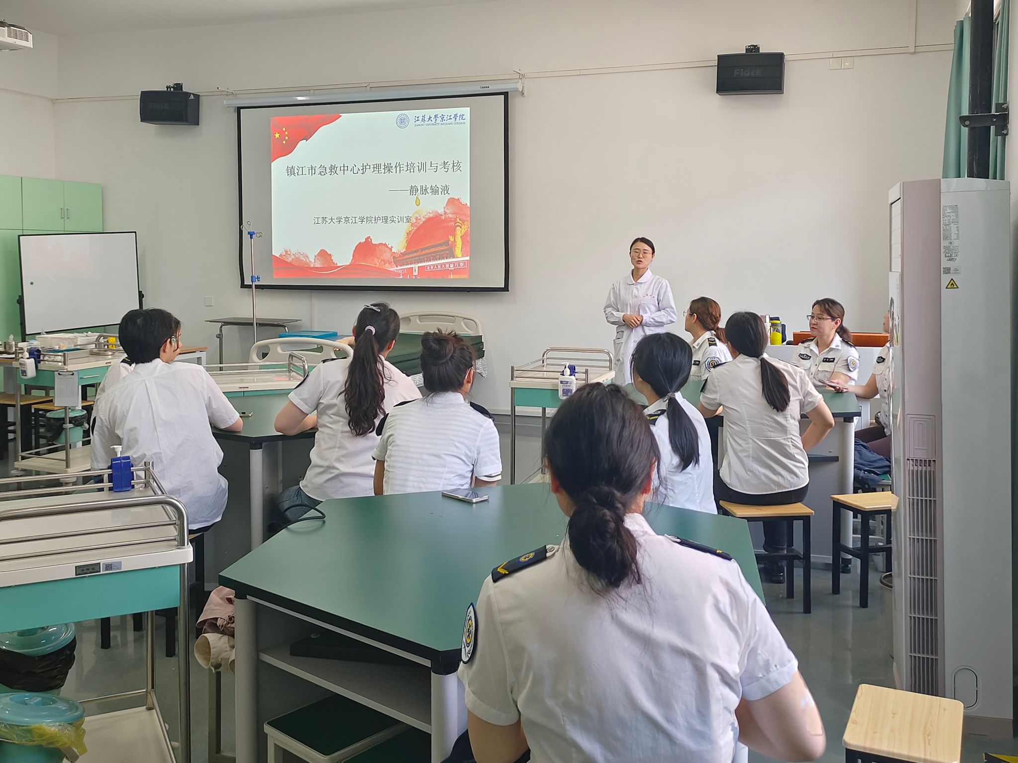 护理实训室老师朱虹详细讲解和演示了静脉输液的操作流程,并围绕操作要点进行考核。经过认真的练习和培训,镇江市急救中心的13位护士均通过此次考核。