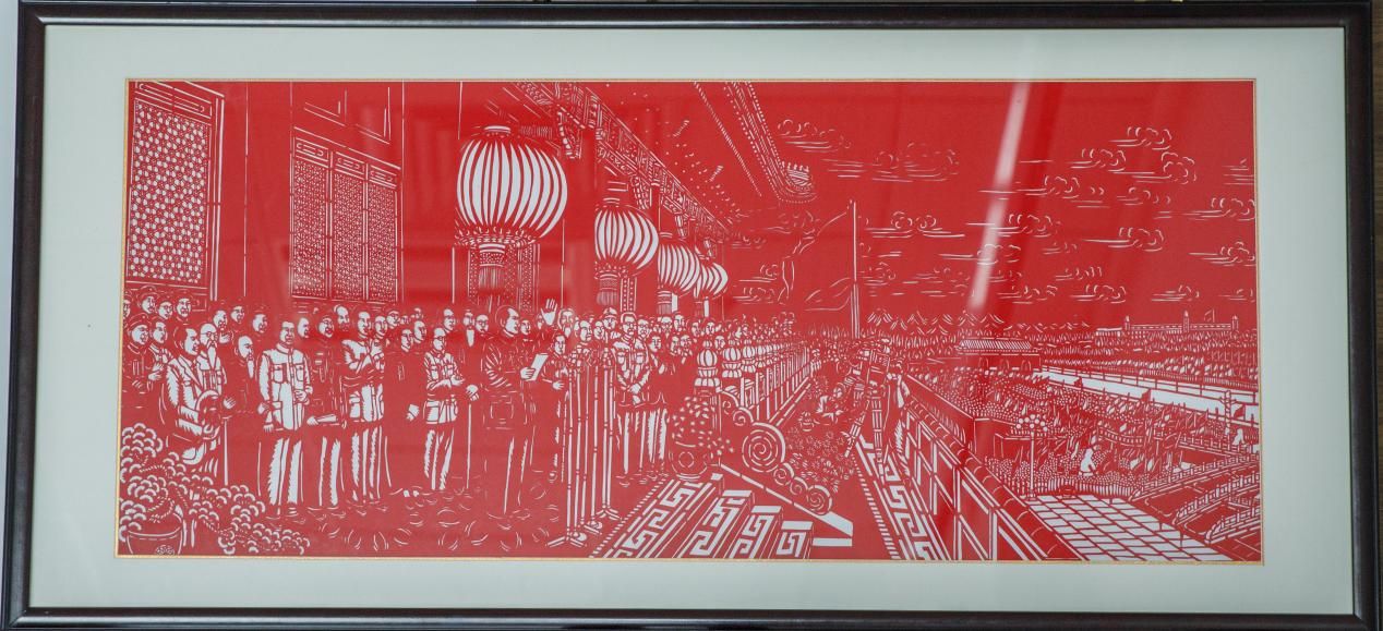 剪纸作品《开国大典》是以1949年10月1日中华人民共和国成立的伟大历史时刻为创作主题,在创作中,教师以“铸牢中华民族共同体意识”为主线,引导学生从历史文献、影像资料中提炼核心元素,采用中国传统剪纸艺术形式,天安门城楼的红墙、飘扬的国旗、沸腾的人群等细节均由学院师生团队历时数月共同完成,生动再现了毛泽东主席在天安门城楼上庄严宣告新中国诞生的恢弘场景。通过剪纸艺术的独特语言,展现了中华民族团结一心、共铸辉煌的精神风貌。