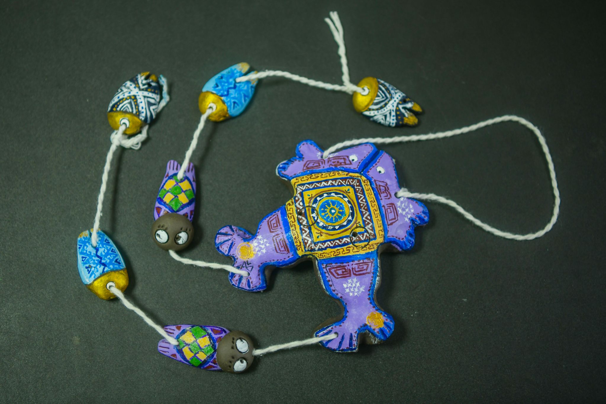 泥塑(太平泥叫叫)扩展作品《鱼跃龙门·锦绣同心》在省级非遗代表性传承人周宝康的技艺指导下,学院师生以“铸牢中华民族共同体意识”为创作核心,以壮族女孩的视角,创新融合镇江非遗“太平泥叫叫”工艺与壮族文化符号。“鱼化龙”经典造型的太平泥叫叫,正面双鱼并游象征“好事成双”,反面龙首昂扬呼应“鱼跃龙门”的进取精神,龙鳞间嵌入壮锦菱形纹与铜鼓太阳纹,象征中华民族农耕文明与青铜文化的千年对话。通过师生共同研习非遗技艺、探讨文化内涵的创作过程,生动诠释了中华民族多元一体的精神内核。
