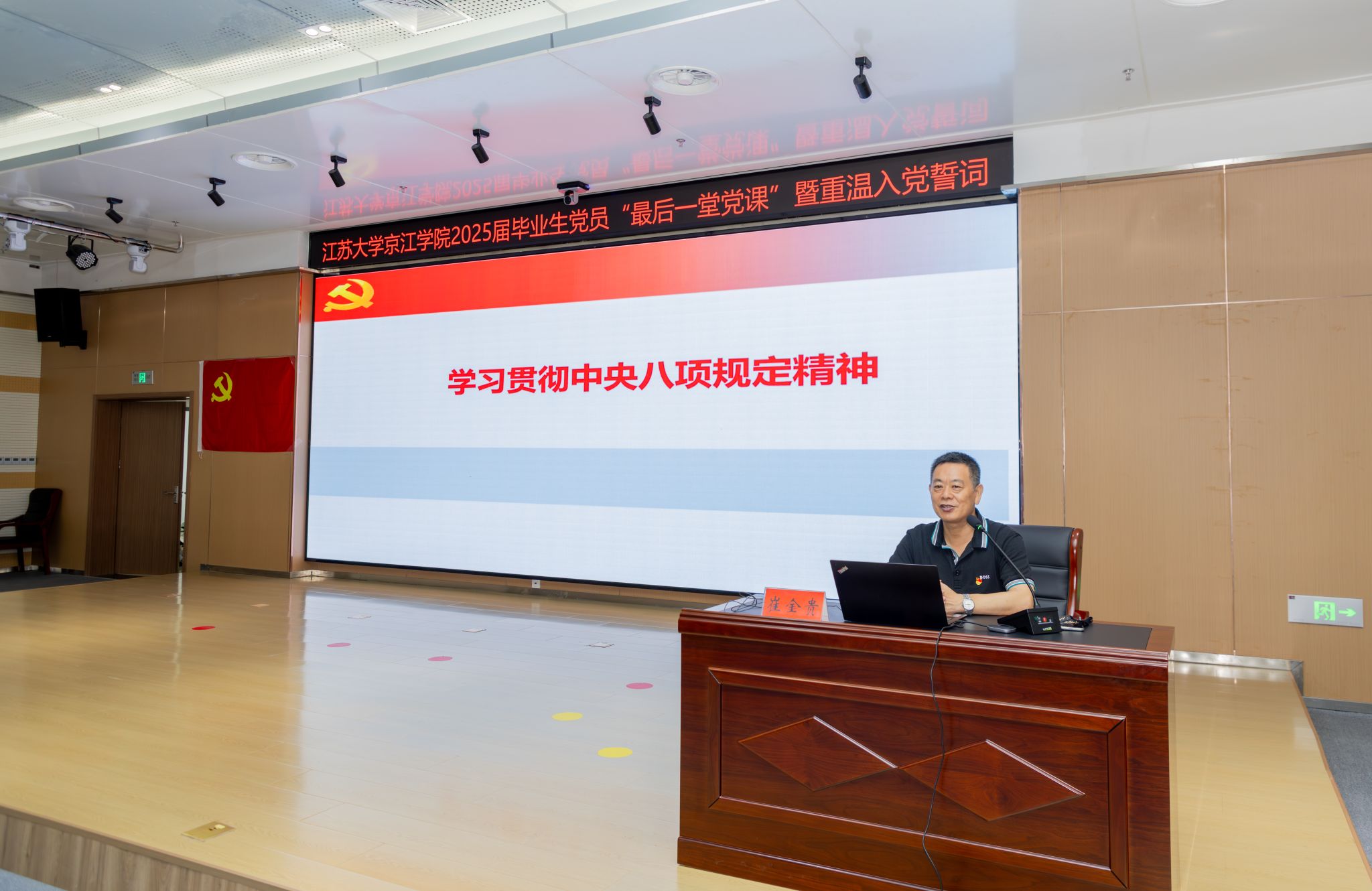 崔金贵以《学习贯彻中央八项规定精神》为题,为全体毕业生党员讲授“最后一堂党课”。他从中央八项规定出台背景切入主题,带领大家共同学习了习近平总书记关于中央八项规定的重要论述,逐条解读《中央八项规定实施细则》。党课内容深入浅出,既有理论高度,又结合现实案例。希望大家在今后的工作中,始终将中央八项规定精神内化于心、外化于行,始终以党员的标准严格要求自己。